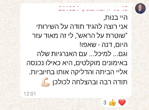 ״בזמן קצר מאוד ובאימונים מאוד הצלחתי לעשות מהפך בחיים שלי... אני נראית הרבה יותר טוב, ומרגישה הרבה יותר טוב...אני נתתי לעצמי מתנה נפלאה ומאחלן לכולכן לתת לעצמכן את המתנה הזו גם״